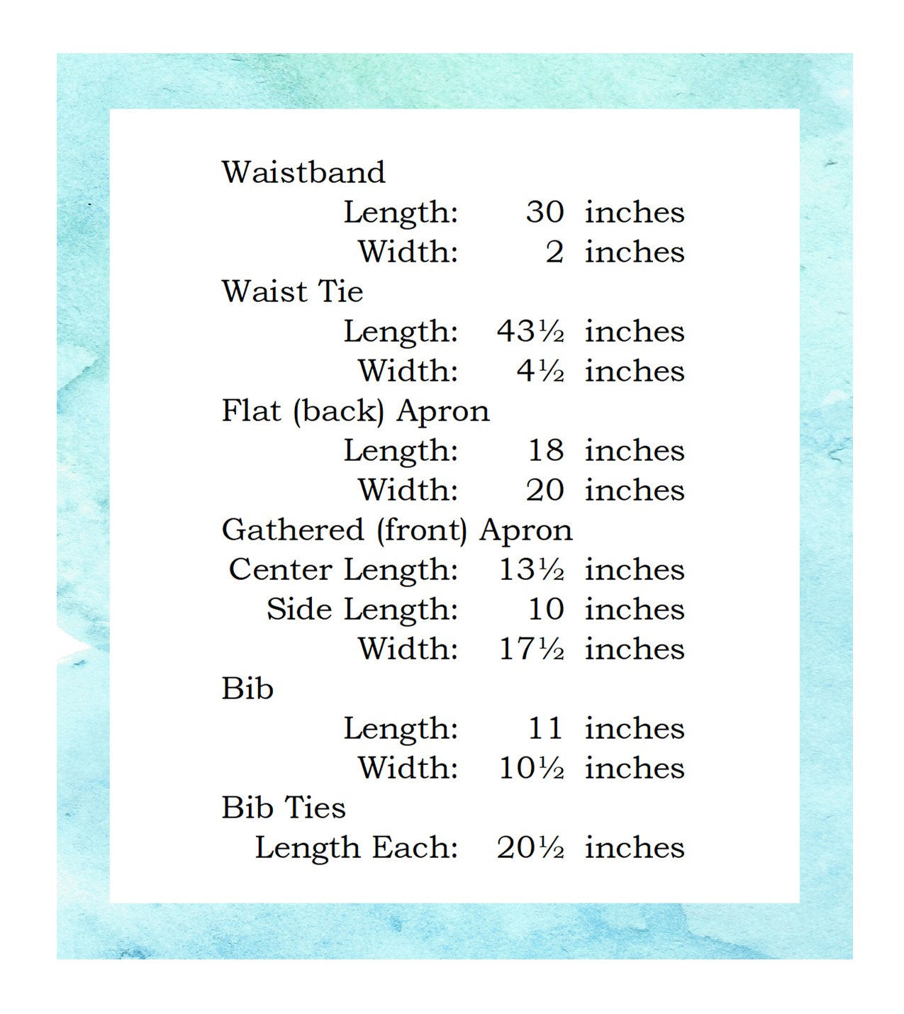 Apron is handmade of 100% cotton quality fabric that can be washed in cool water with mild soap, no bleach, and dried at a low temperature to prevent unwanted color loss and shrinkage.