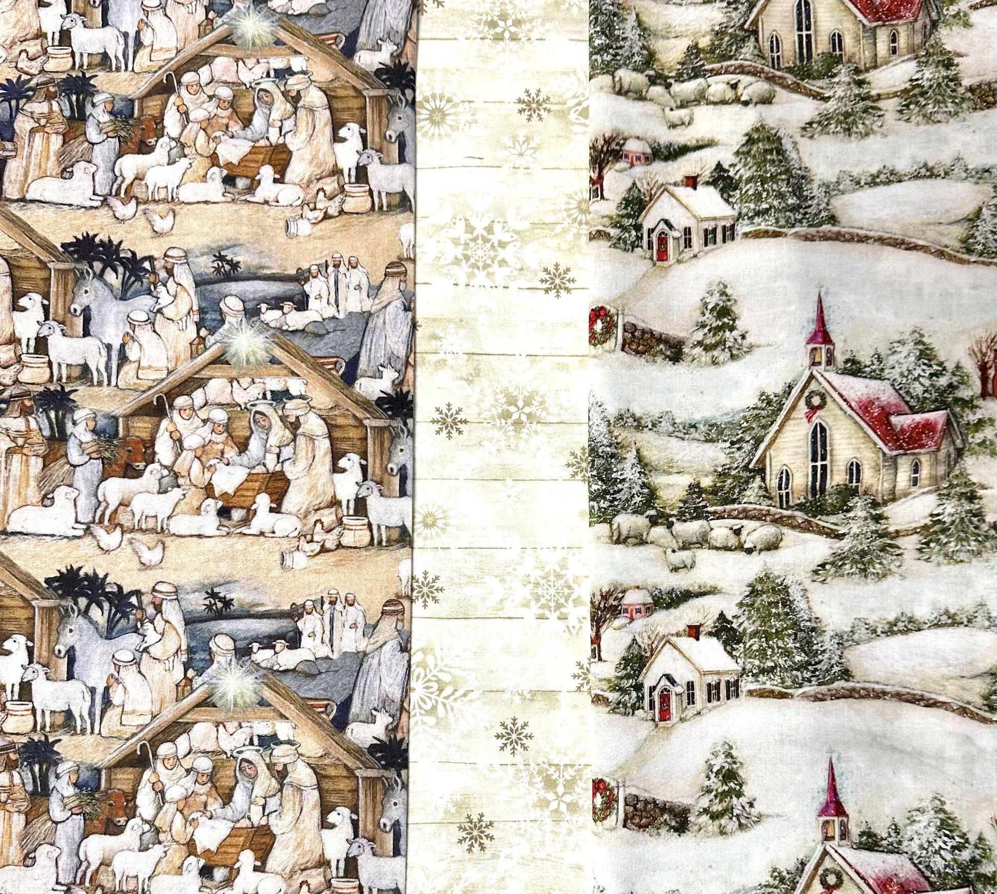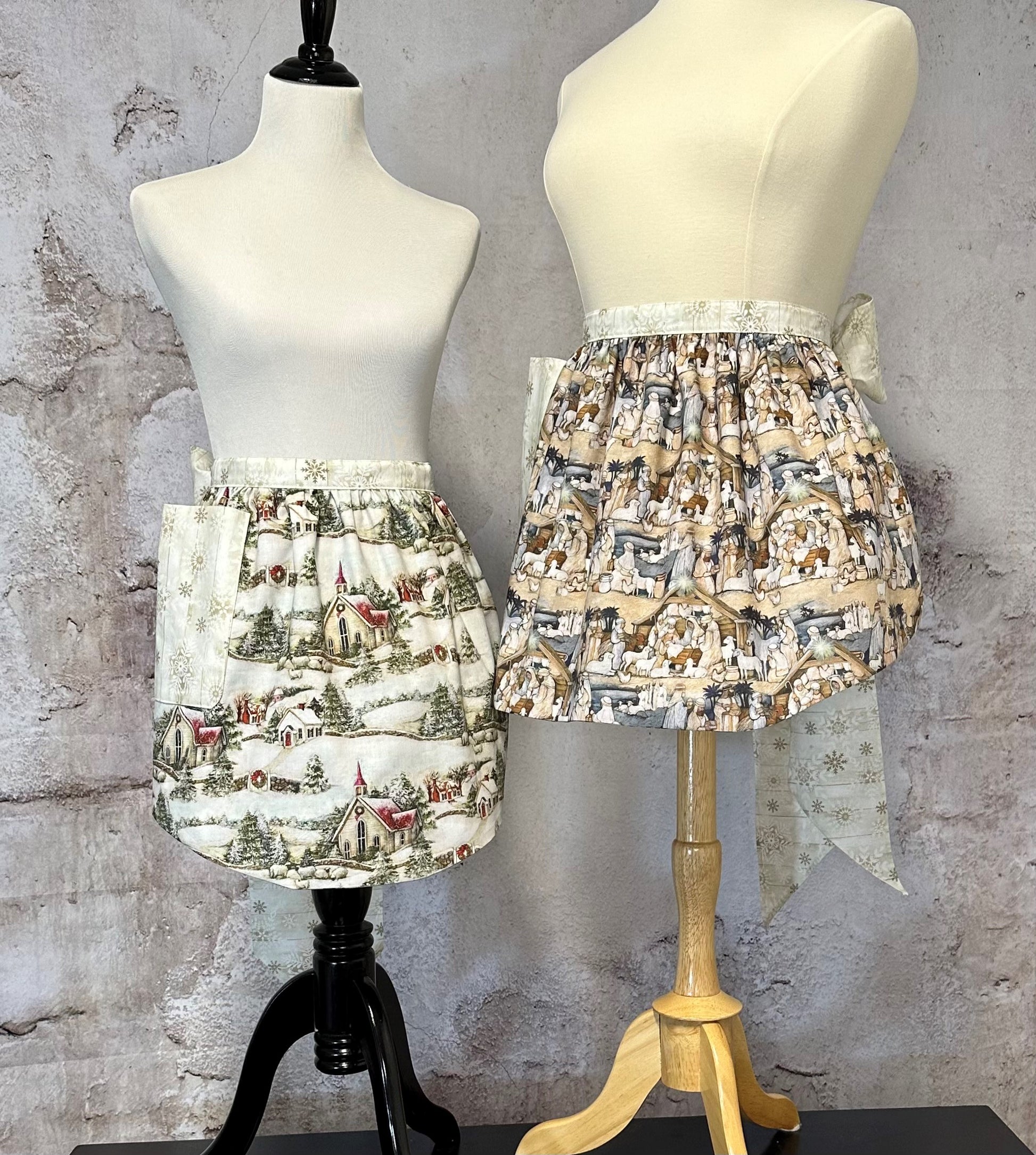 The true meaning of Christmas depicted on a beautiful, useable apron. A nativity scene complete with Baby Jesus, Mother Mary, Joseph, the manger, the Three Wise Men, the Shepards and their flocks is on one side of the apron and the other depicts a Country Church in the snowy hills. What better way to show your faith than to wear this apron during the holidays, and year round!