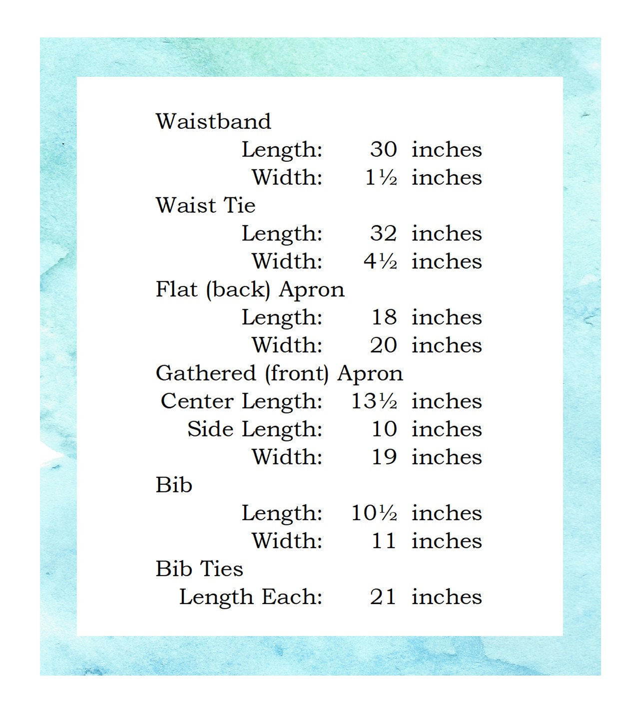 Apron is handmade of 100% cotton quality fabric that can be washed in cool water with mild soap, no bleach, and dried at a low temperature to prevent unwanted color loss and shrinkage.